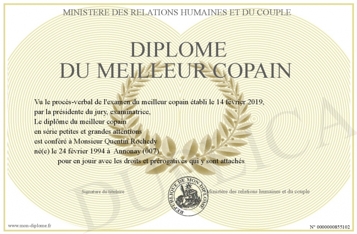 Envoyez par email votre Diplôme du meilleur copain personalisé