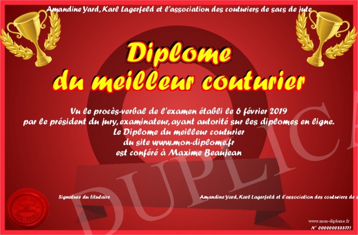 Envoyez par email votre Diplôme du meilleur couturier personalisé