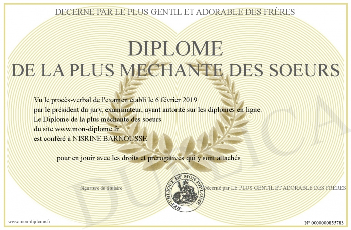 Envoyez par email votre Diplôme de la plus méchante des soeurs personalisé