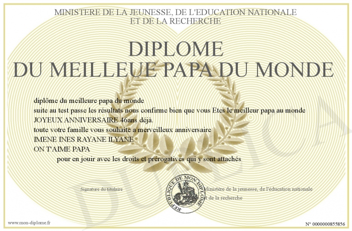 Envoyez par email votre Diplôme DU MEILLEUE PAPA DU MONDE personalisé
