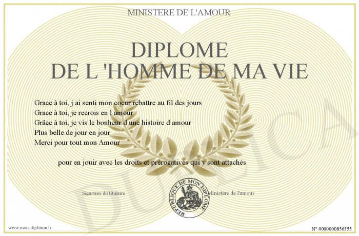 Envoyez par email votre Diplôme de l 'homme de ma vie personalisé