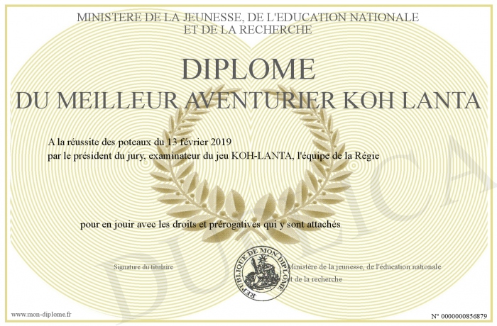 Envoyez par email votre Diplôme du meilleur aventurier KOH LANTA personalisé