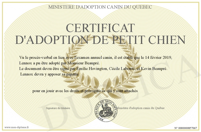 Envoyez par email votre Certificat d'adoption de petit chien personalisé