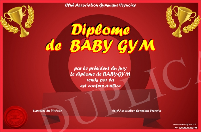 Envoyez par email votre Diplôme de BABY GYM personalisé