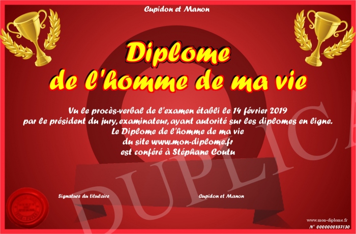 Envoyez par email votre Diplome de l'homme de ma vie personalisé
