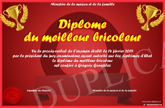 Envoyez par email votre Diplôme du meilleur bricoleur personalisé