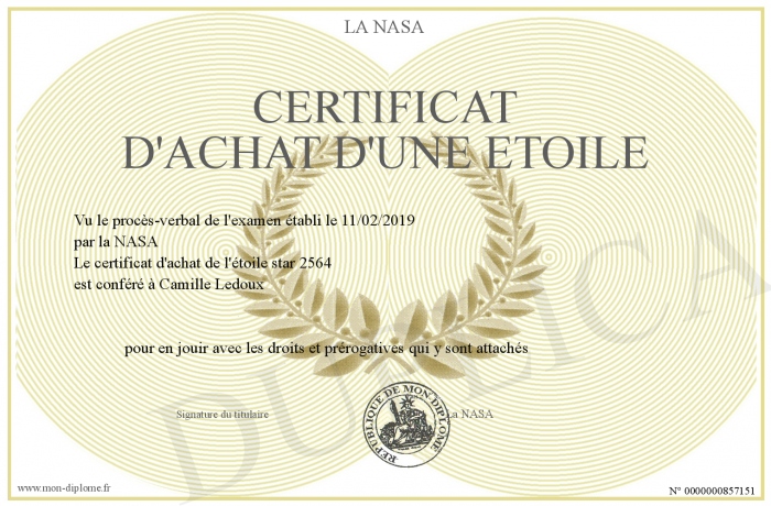 Envoyez par email votre Certificat d'achat d'une étoile personalisé