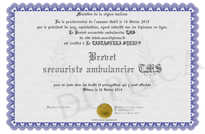 Envoyez par email votre Brevet secouriste ambulancier TMS personalisé