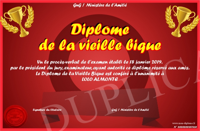 Envoyez par email votre Diplôme de la vieille bique personalisé