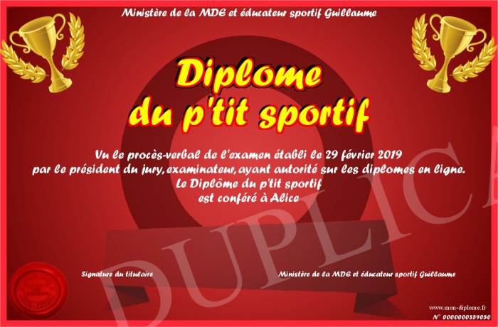 Envoyez par email votre Diplôme du p'tit sportif personalisé