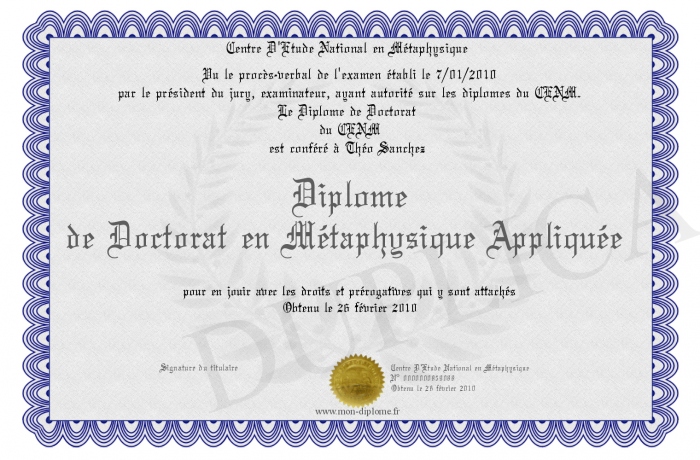 Envoyez par email votre Diplome de Doctorat en Métaphysique Appliquée personalisé