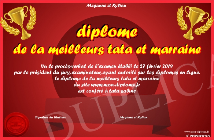 Envoyez par email votre diplôme de la meilleurs tata et marraine personalisé