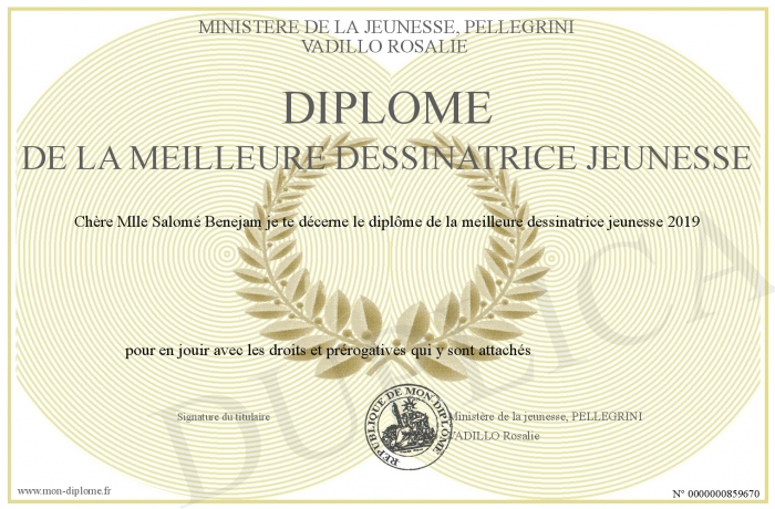 Envoyez par email votre Diplôme de la meilleure dessinatrice jeunesse personalisé