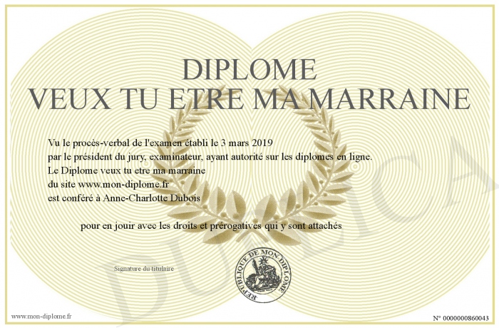 Envoyez par email votre Diplôme veux tu etre ma marraine personalisé