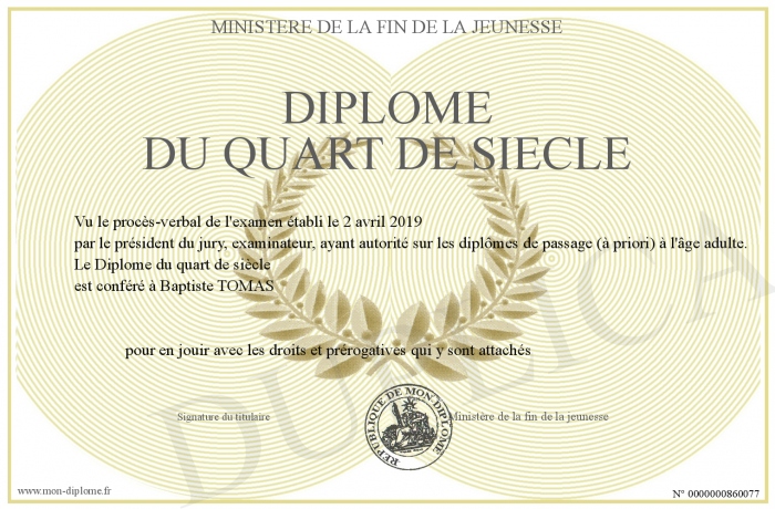Envoyez par email votre Diplôme du quart de siècle personalisé