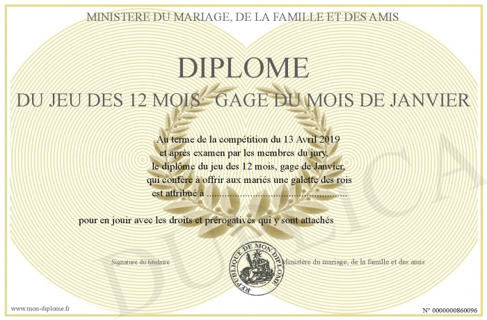 Envoyez par email votre Diplôme du jeu des 12 mois gage du mois de JANVIER personalisé
