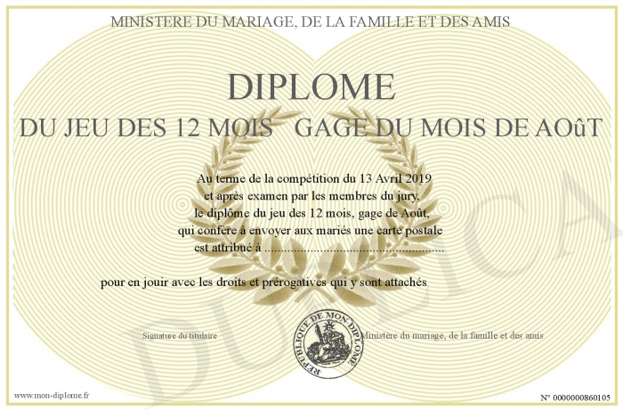 Envoyez par email votre Diplôme du jeu des 12 mois gage du mois de Août personalisé