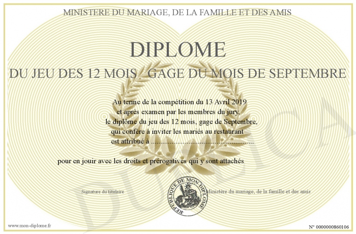 Envoyez par email votre Diplôme du jeu des 12 mois gage du mois de septembre personalisé