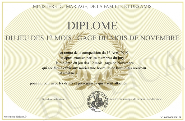 Envoyez par email votre Diplôme du jeu des 12 mois gage du mois de novembre personalisé