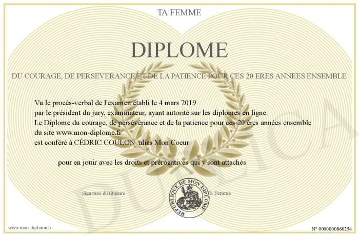 Envoyez par email votre Diplôme du courage, de persévérance et de la patience pour ces 20 ères années ensemble personalisé