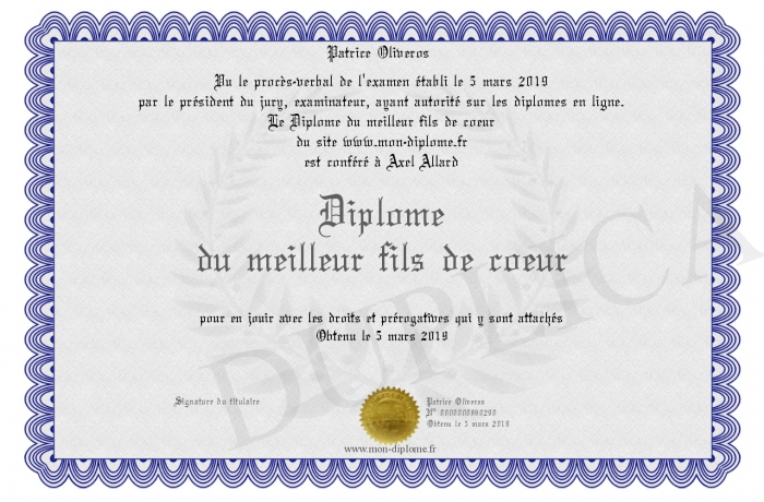 Envoyez par email votre Diplôme du meilleur fils de coeur personalisé