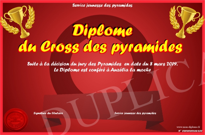 Envoyez par email votre Diplôme du Cross des pyramides personalisé