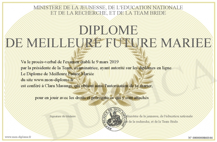 Envoyez par email votre Diplôme de Meilleure Future Mariée personalisé