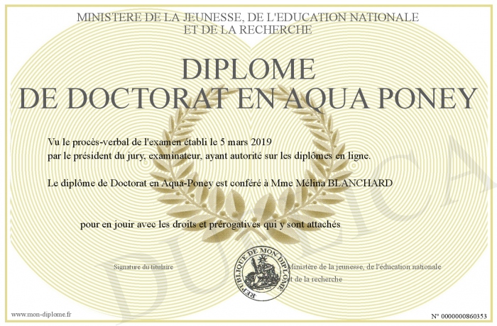Envoyez par email votre Diplôme de Doctorat en Aqua Poney personalisé