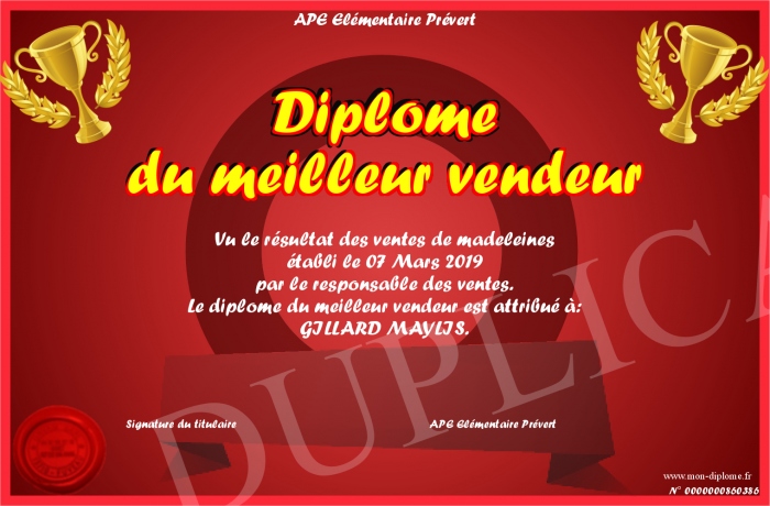 Envoyez par email votre Diplôme du meilleur vendeur personalisé