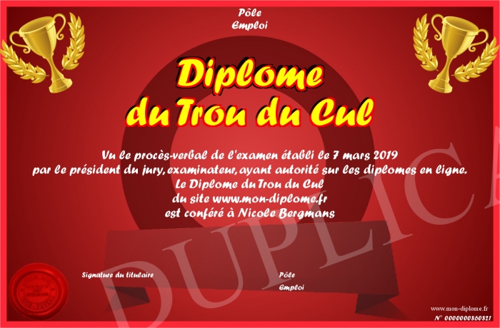 Envoyez par email votre Diplôme du Trou du Cul personalisé