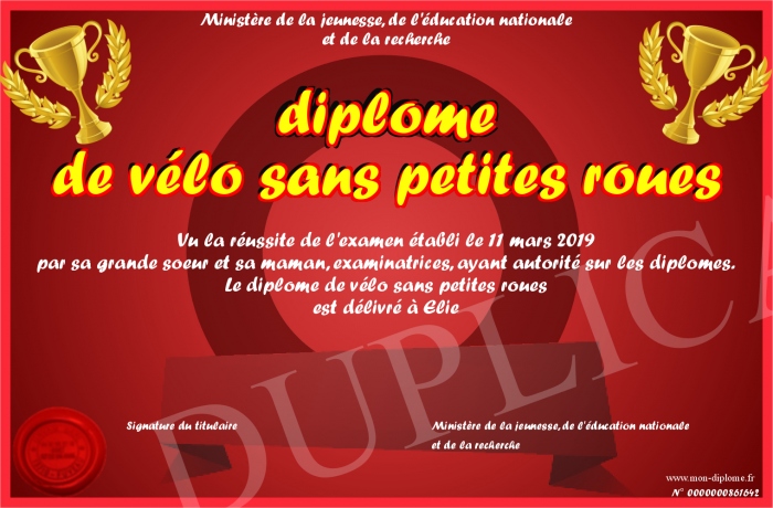 Envoyez par email votre diplôme de vélo sans petites roues personalisé