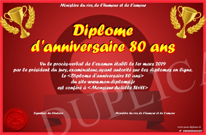 Envoyez par email votre Diplome d'anniversaire 80 ans personalisé