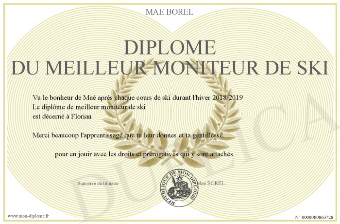 Envoyez par email votre Diplôme du meilleur moniteur de ski personalisé