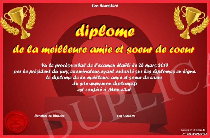Envoyez par email votre diplôme de la meilleure amie et soeur de coeur personalisé