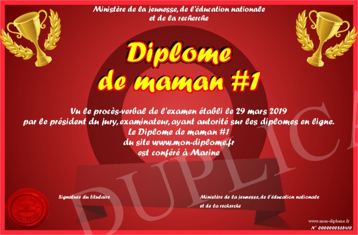 Envoyez par email votre Diplôme de maman #1 personalisé