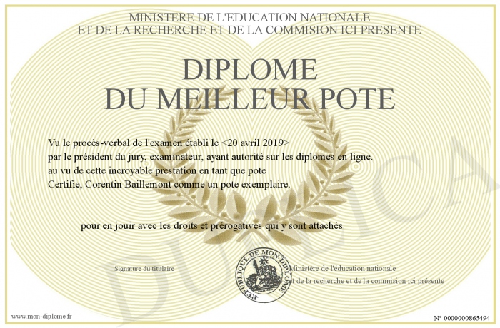Envoyez par email votre Diplôme du meilleur pote personalisé
