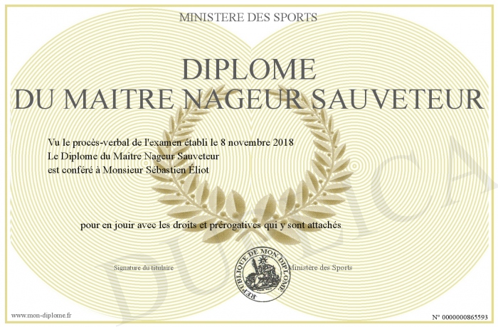 Envoyez par email votre Diplôme du Maitre Nageur Sauveteur personalisé