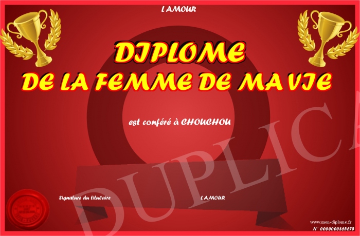 Envoyez par email votre DIPLOME DE LA FEMME DE MA VIE personalisé