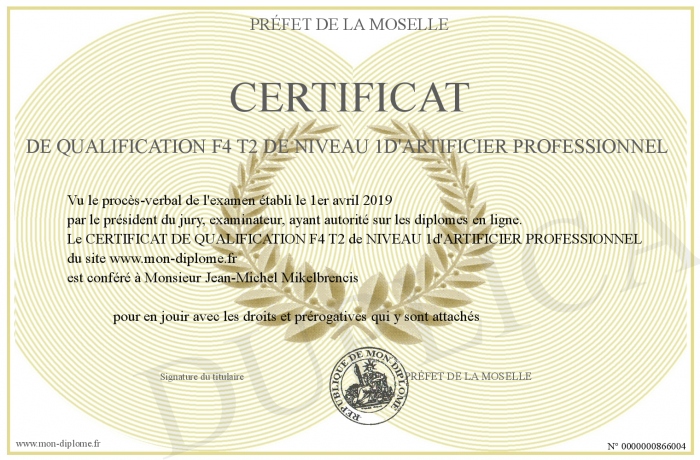 Envoyez par email votre CERTIFICAT DE QUALIFICATION F4 T2 de NIVEAU 1d'ARTIFICIER PROFESSIONNEL personalisé