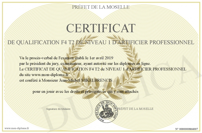 Envoyez par email votre CERTIFICAT DE QUALIFICATION F4 T2 de NIVEAU 1 d'ARTIFICIER PROFESSIONNEL personalisé