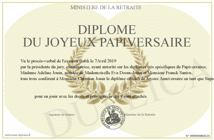 Envoyez par email votre Diplôme du Joyeux Papiversaire personalisé