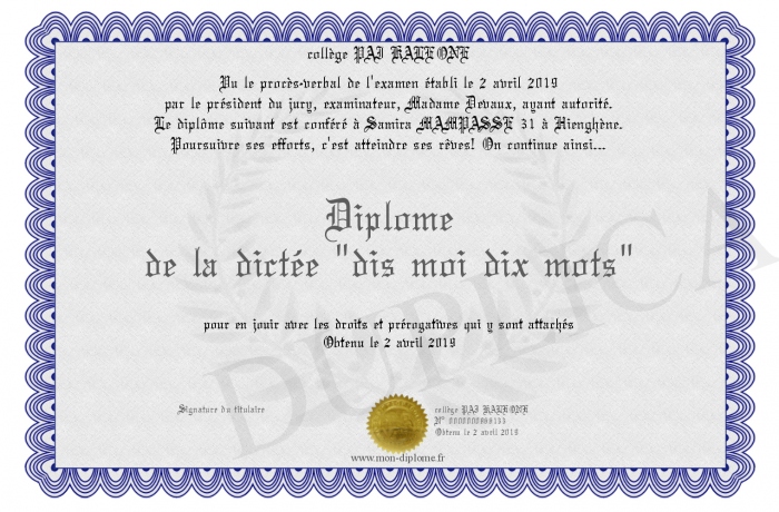 Envoyez par email votre Diplôme de la dictée -dis moi dix mots- personalisé