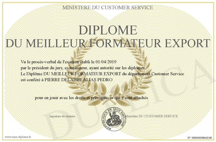 Envoyez par email votre Diplôme DU MEILLEUR FORMATEUR EXPORT personalisé