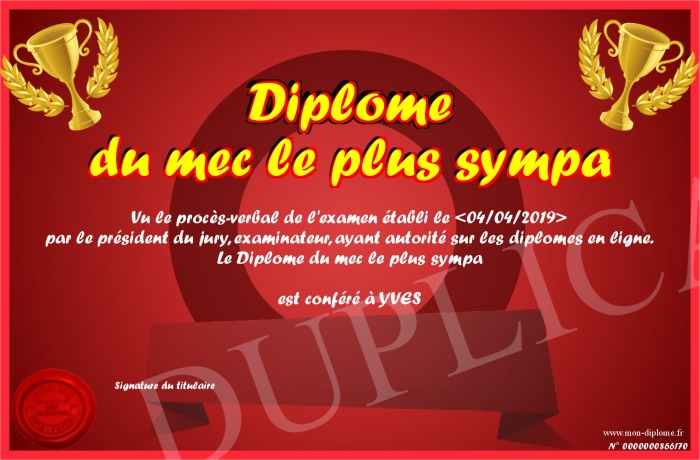 Envoyez par email votre Diplôme du mec le plus sympa personalisé