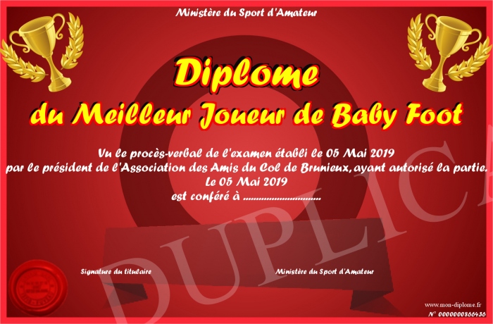 Envoyez par email votre Diplôme du Meilleur Joueur de Baby Foot personalisé