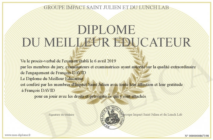 Envoyez par email votre Diplôme du Meilleur Educateur personalisé