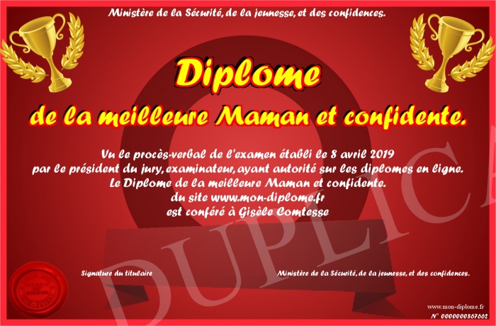 Envoyez par email votre Diplôme de la meilleure Maman et confidente. personalisé