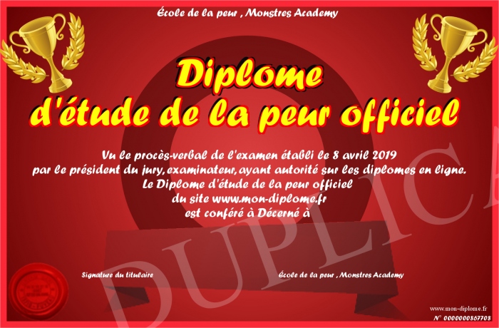 Envoyez par email votre Diplôme d'étude de la peur officiel personalisé