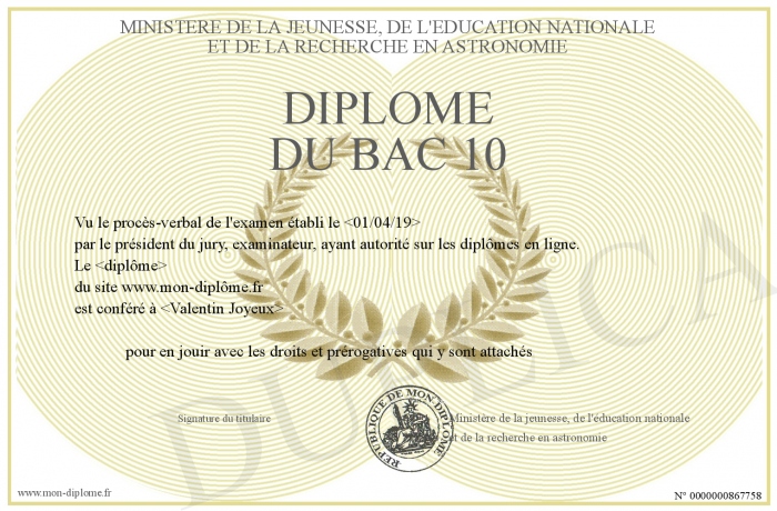 Envoyez par email votre Diplôme du bac 10 personalisé