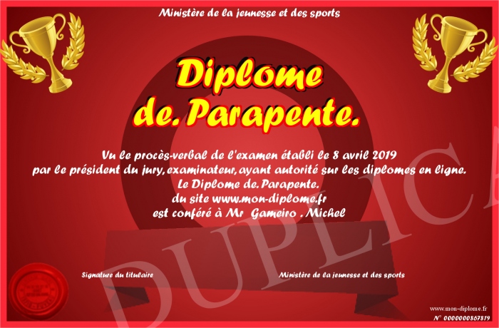 Envoyez par email votre Diplôme de. Parapente. personalisé